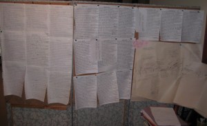 This is what draft number three of part one of my novel looks like. There are twenty five chapters in each part. Each A4 seen here is merely a chart of plot points for each chapter, and the butcher paper in the bottom right hand corner is the ‘timeline’ and something not always totally disregarded. Pinned up this way the plan takes up a fair bit of space but it is far easier to see, in full, the nascent story with its glaring inconsistencies due to countless alterations to characters, names, plot, points of view, etc, made along the way. It’s all there at a glance and is helping to pave a tough road.