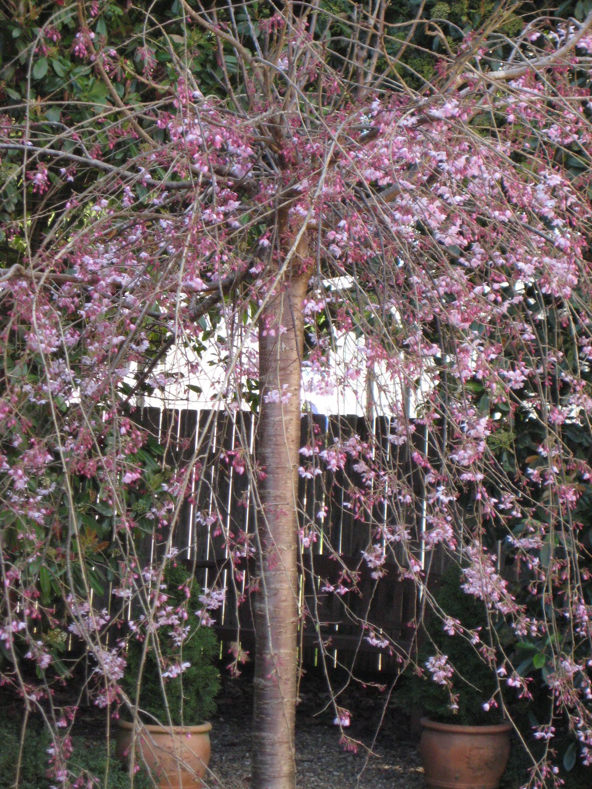 One of two glorious weeping cherry trees in the back yard who managed to hang onto their blossoms despite the August winds.