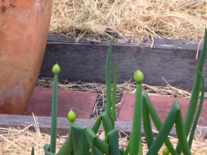 My about-to-bloom spring onions. These are way too furry to eat and the gooey sap would put anyone off attempting it, but I didn’t have the heart to remove them when they’re just about to flower. Can’t wait to see those mauve pompoms!