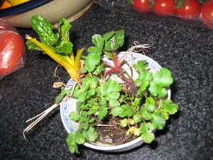 Some stunted ‘rescues’: coriander and chard. After three days inside with their feet in a bowl of water they have already begun growing. I’ll baby them in punnets for a few more weeks as we had a monster frost this morning.