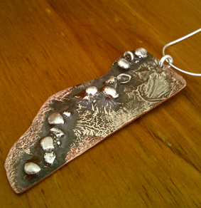 So on Saturday I took myself off to Ken Raffe’s and fused some fine silver to copper and made a pendant out of it.