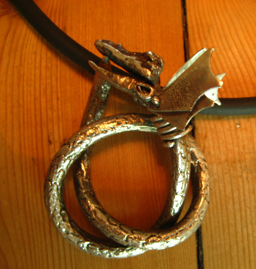 I made this little (well, not so little!) beasty on consignment. Never have I come against so many consecutive challenges as I did while making it (the wrong silver hardness, refusal to solder, my own transient despair in coming to the conclusion that it really ought to have been a piece cast using the lost wax process instead of hand-forging…), and never have I come so close to giving up on something. But with Ken Raffe’s deft hand, wonderful wit, and both of us at either end of a vice, a dragon ouroboros pendant came into being.