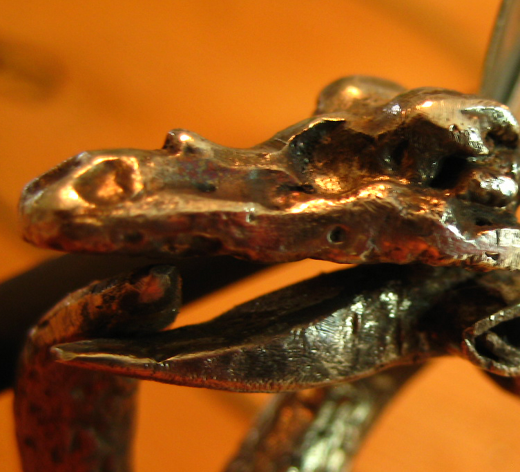 A bit Tyrannosaurus-Rex-skull-ish, quite different to what I had initially designed. I recognise the basic form of my design, but as the head has been built by fusing recycled silver offcuts and then removing it to form the dragon features, it has resulted in a far more abstract, ‘ad-libbed’ head than I had drawn.