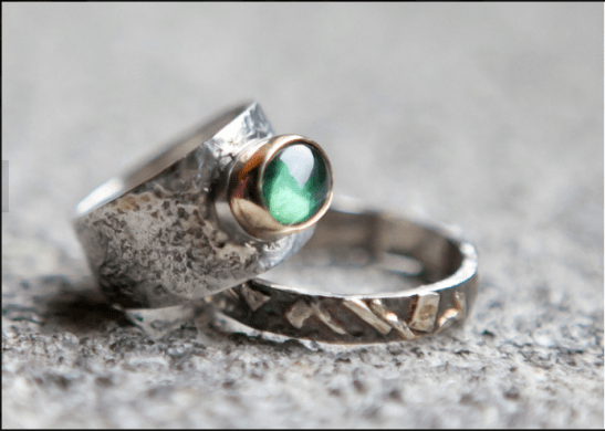 mine and the Etruscan’s wedding rings – sterling silver, 18k gold, tourmaline 2015