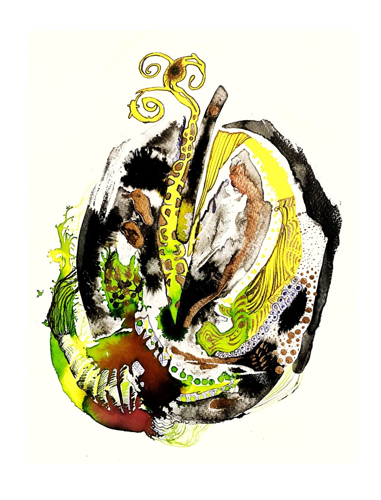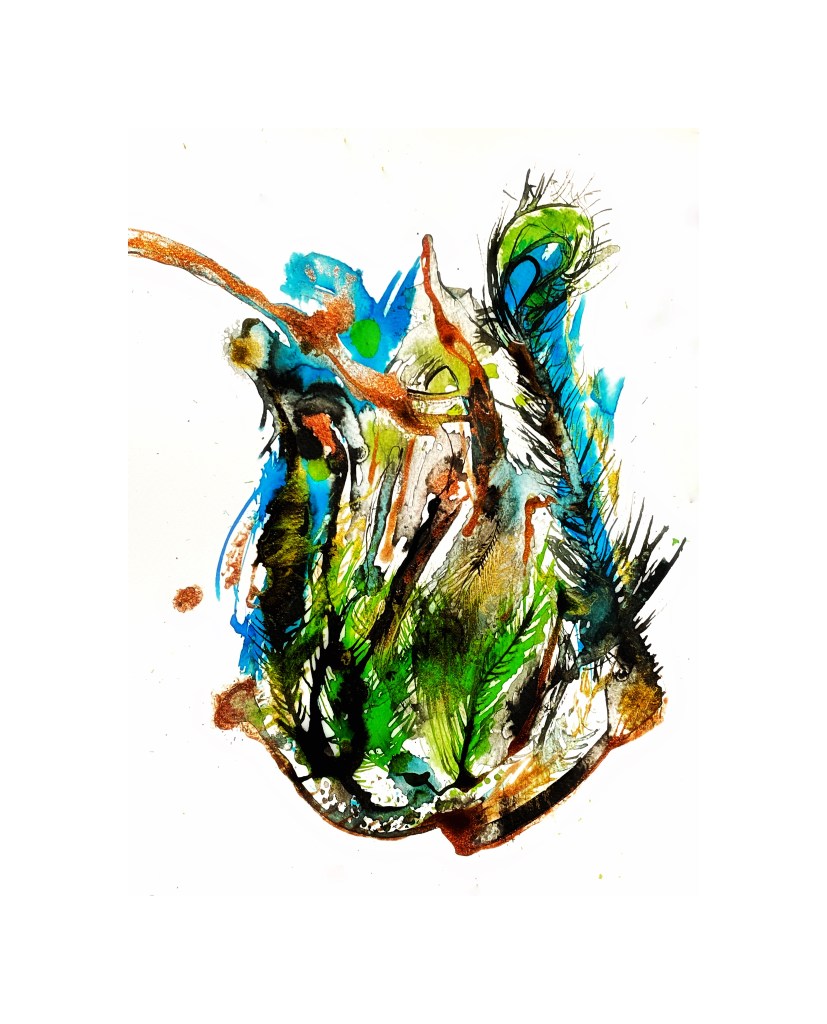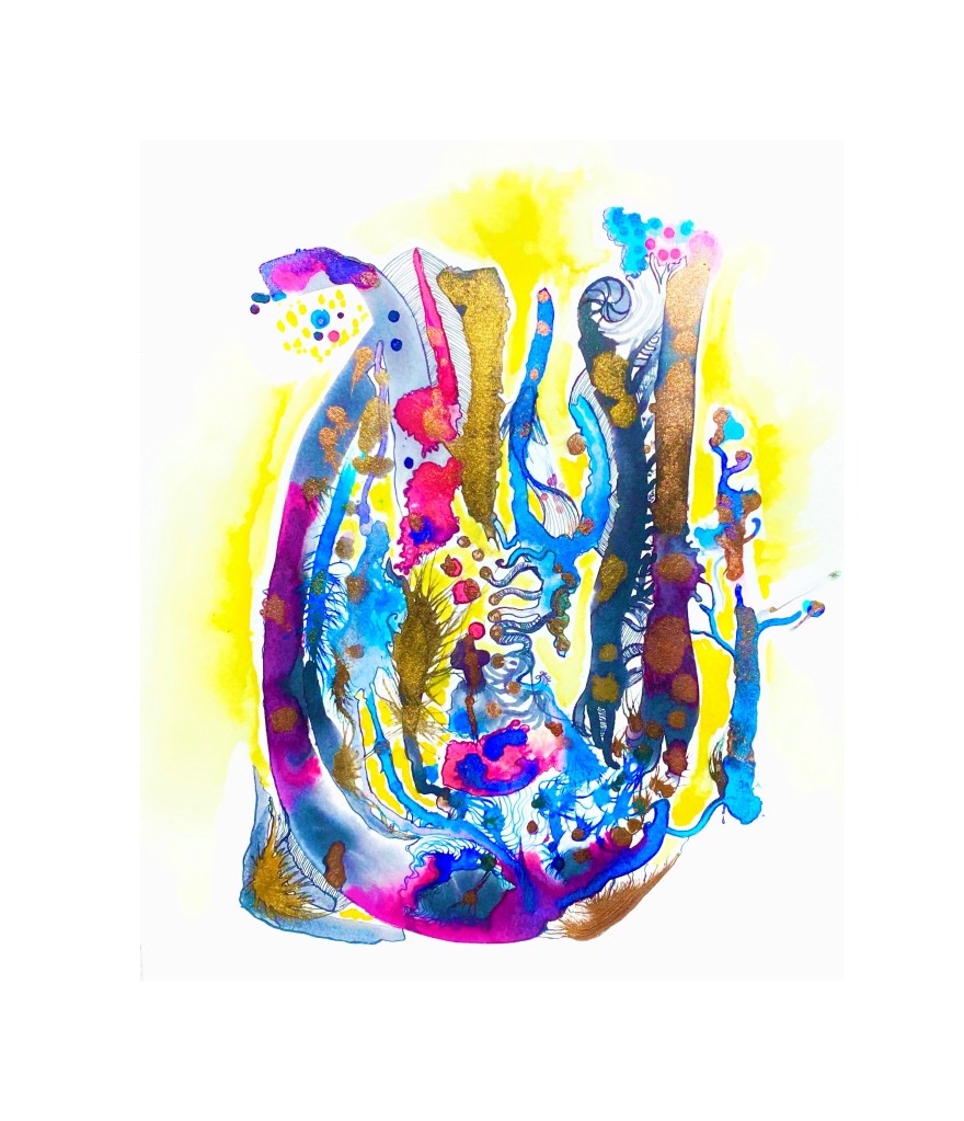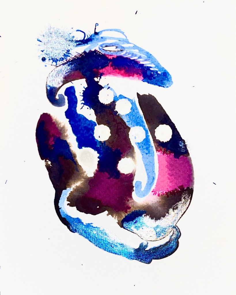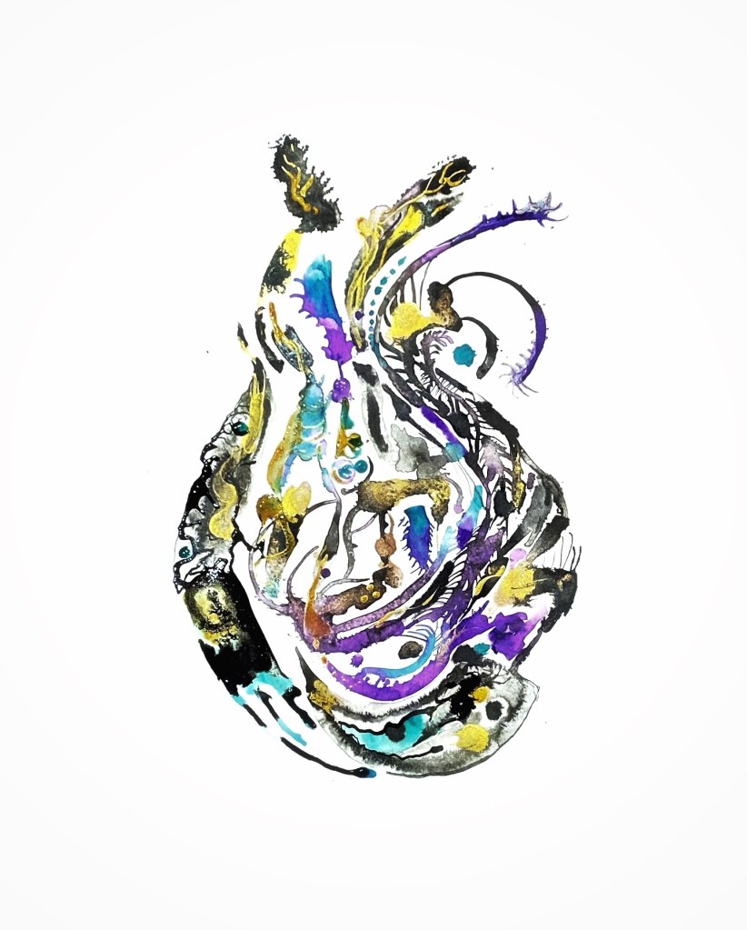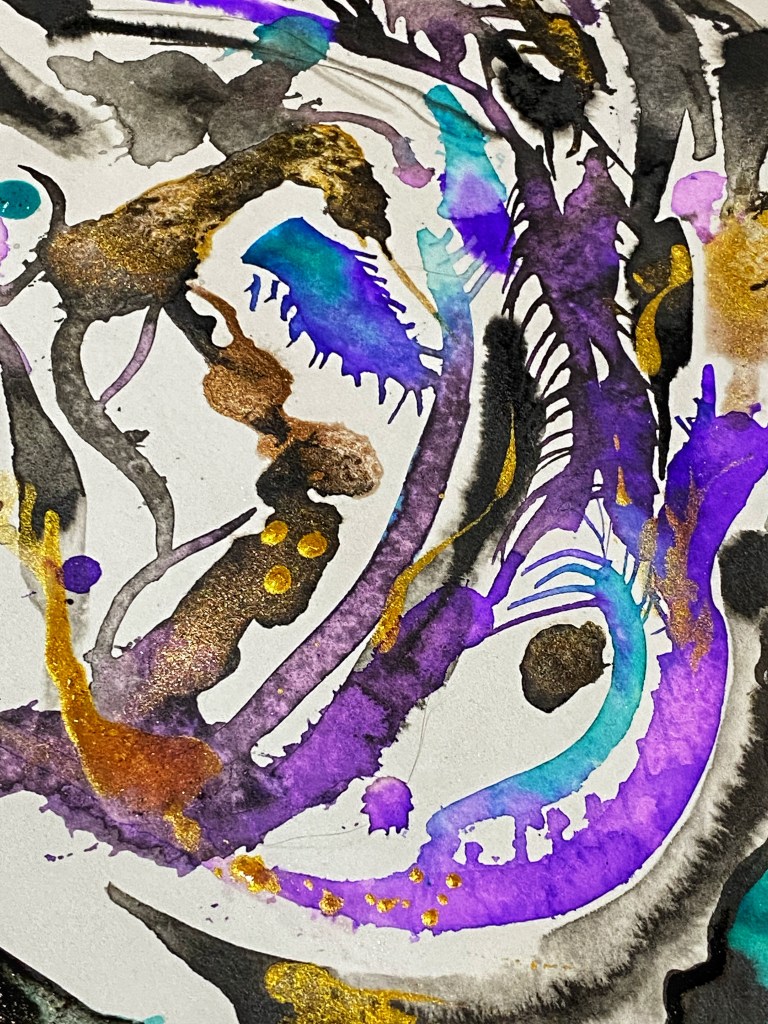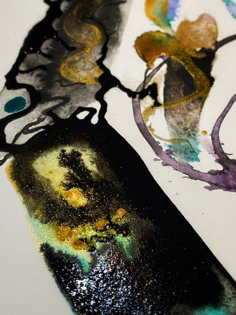 The Heart Series is an exploration and dissection of the heart (mine) and what it holds at any given time, after the fallout of the last two years. It changes daily and through intuitive painting, and the flow of ink from the liminal spaces I, as a human being, don’t always have the capacity to face full on. There are frightening and murky realities. As artist and poet I can at least edge ever closer to the truth of things.