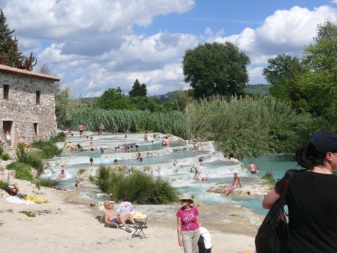 It was a hot day and we were full and a lot less than willing to walk any further, so we were shuttled by our drivers down to the Cascata del Mulino hot springs below the ancient spa village of Saturnia. The geothermal water surges out at 800 litres per second at a temp of 37.5C/99.5F, and has a high content of sulphur that darkened our silver jewellery and made steel wool of our hair.