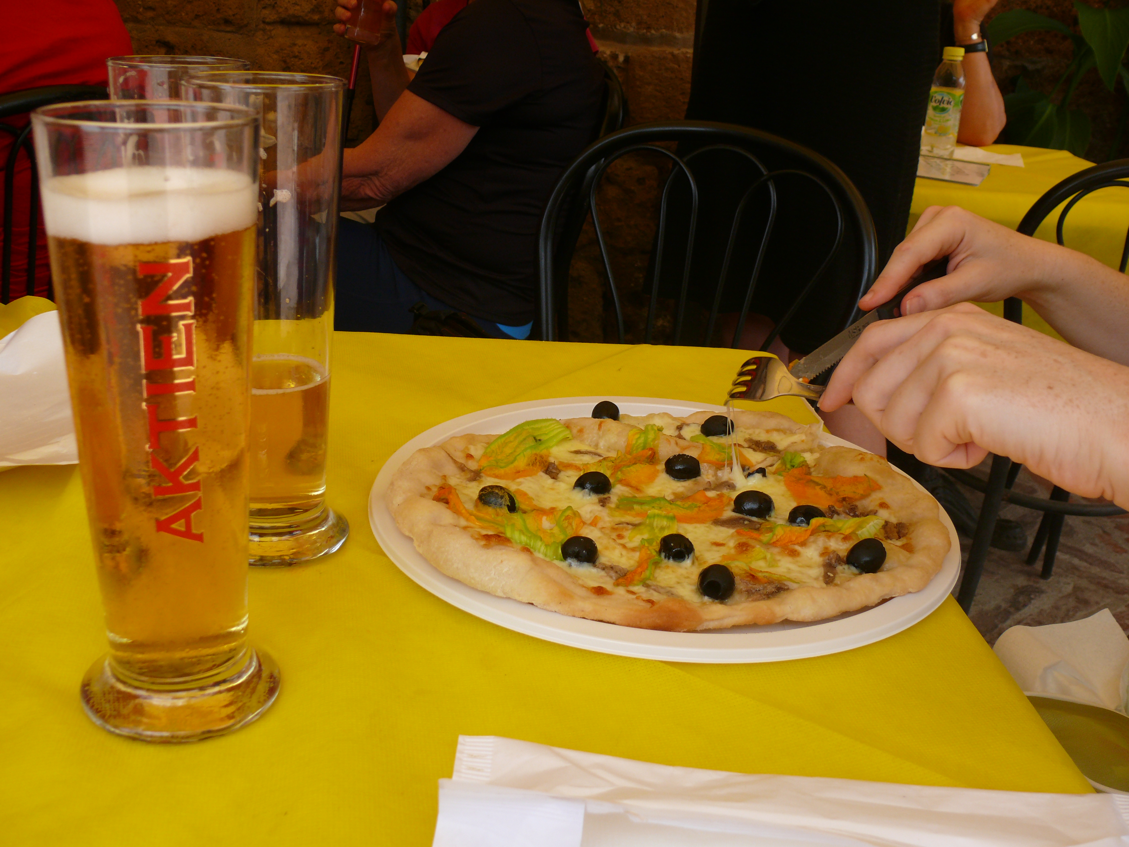 We started early and hiked an ascent of around 200 metres from the town of Pitigliano, reaching the river Lente and joining the Vie Cave (tr: “carved roads”) to Sovana, another Etruscan town. Breakfast isn’t a big deal in Italy, so we were all ravenous by the end of the walk – which wasn’t supposed to be the end, but we made it so with pizza in town. Way too much, way too late in the day. Zucchini e salsiccia – I remember the yolk-yellow flowers cast in a veneer of hot mozzarella.